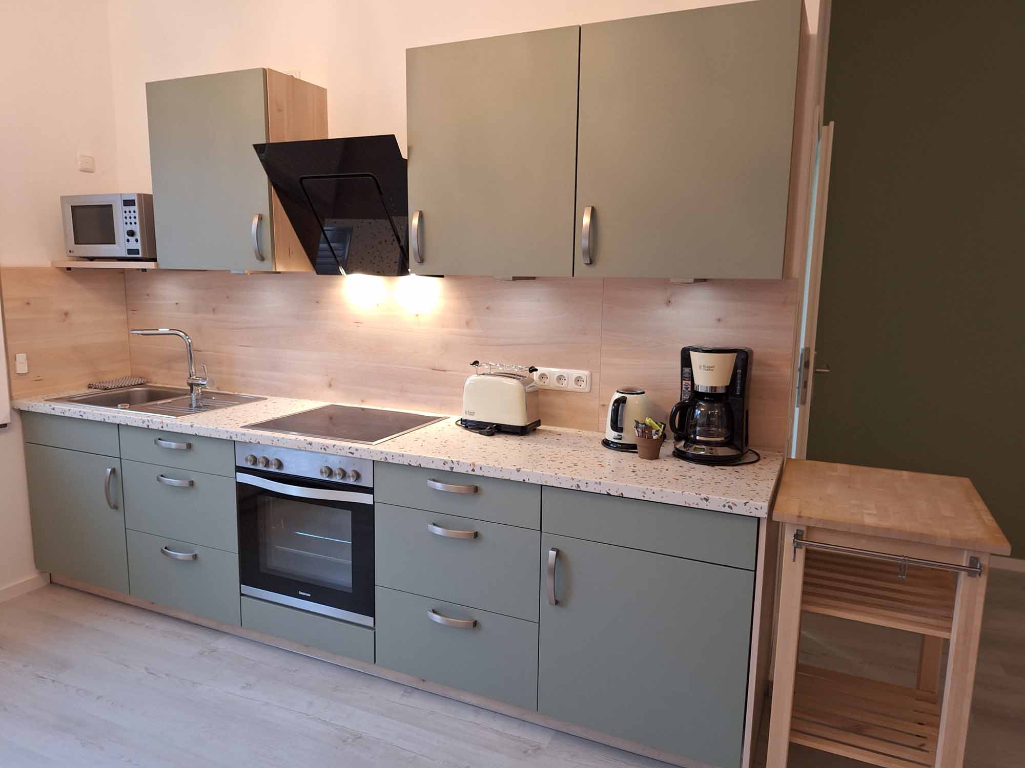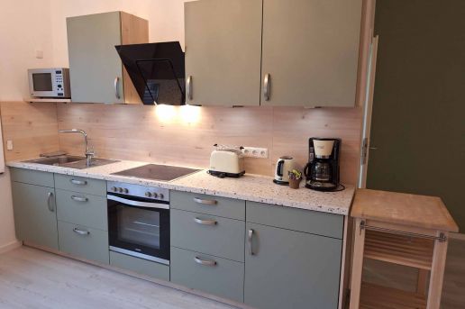 Durch den ebenerdigen Eingang, breite Türen, Küchen- und Bad-Ausstattung ist die Ferienwohnung barrierefrei und für Rollstuhlfahrer behindertengerecht. In der Küchenzeile des Apartments sind alle gängigen Utensilien vorhanden, so dass Sie sich selbst versorgen können, sofern Sie dies möchten.